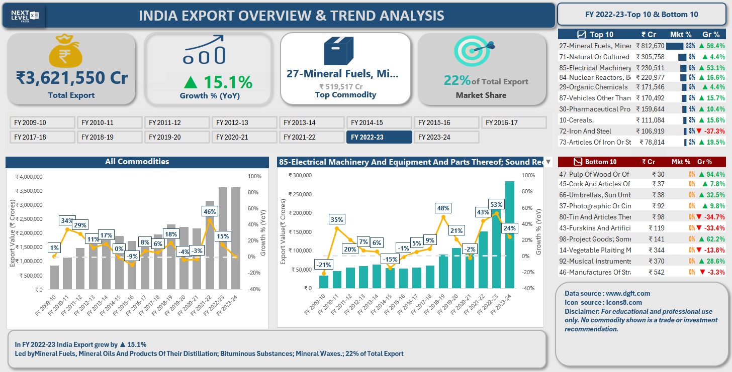 Get a bird’s-eye view of India’s export performance across years. Track total exports, YoY growth, top commodities, and long-term trends.